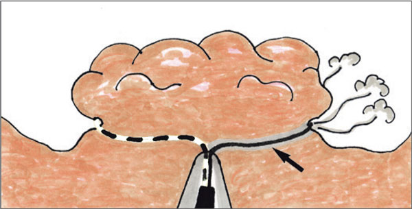 Gewebeschädigungen (Koagulations- plus Devitalisationszonen) verursachen (siehe Pfeil).